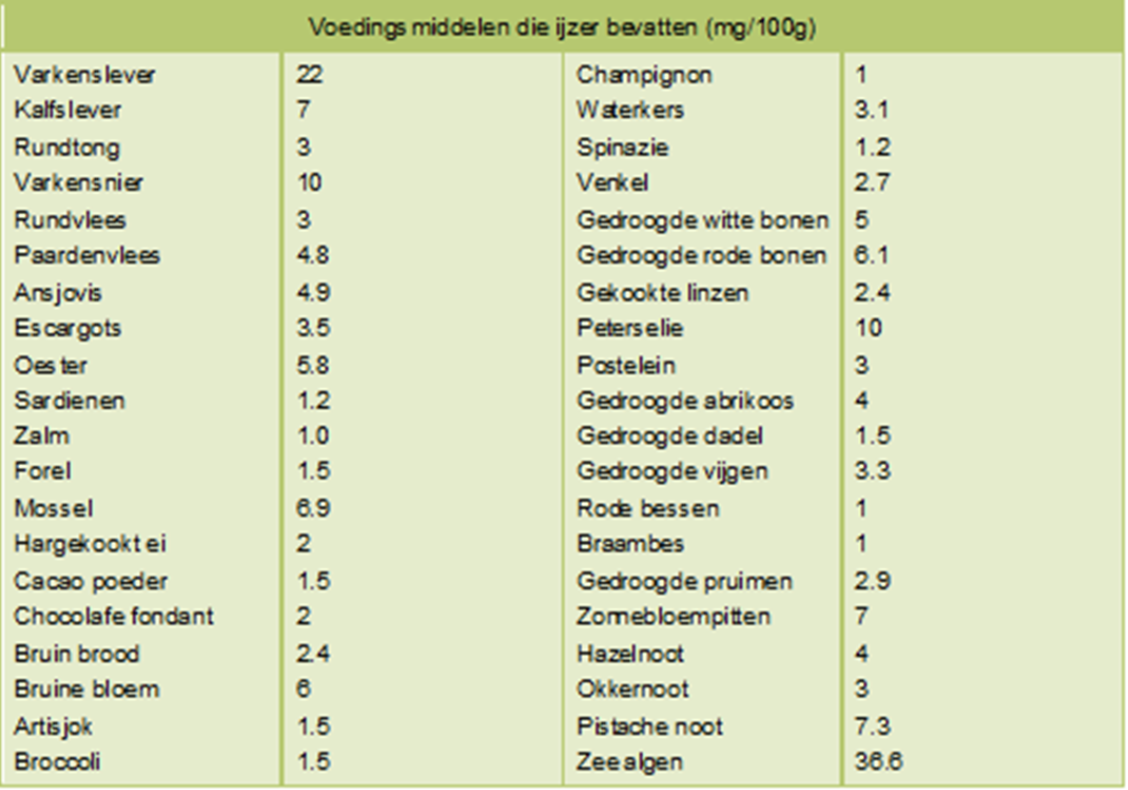 Dat is een heel terechte vraag. Er is veel belangstelling voor lijsten met het ijzergehalte van de verschillende voedingsmiddelen, zoals bijvoorbeeld onderstaande lijst. Er zijn ook andere versies met soms wat wisselende getallen, dus altijd verstandig om via internet op zoek te gaan naar aanvullende informatie.